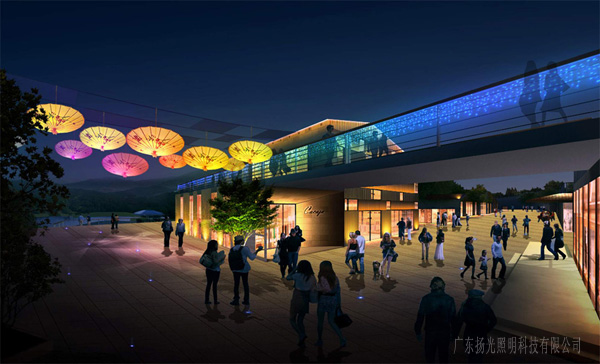 整體以暖色調為主,局部選擇彩色或高色溫光源點綴,凸顯熱鬧繁華的商業氣氛。通過對項目景觀的分析,結合建筑風格,系統的規劃照明水平、控制亮度等級對于表現項目主次、引導游客、豐富夜景、節約能源顯得尤為重要。