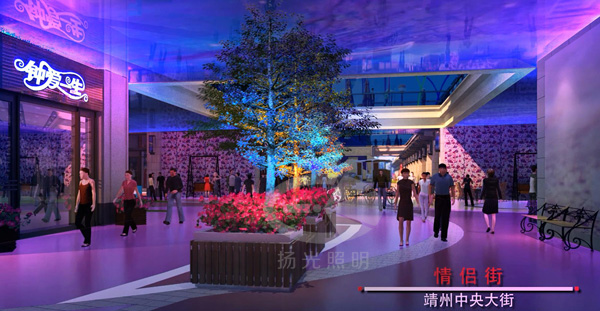 情侶街——采用藍色、紫色等彩色的燈光,來營造一個即神秘、又浪漫的一個燈光氛圍,讓臉上洋溢著甜蜜笑容的戀人們漫步其中。