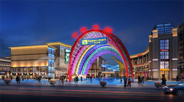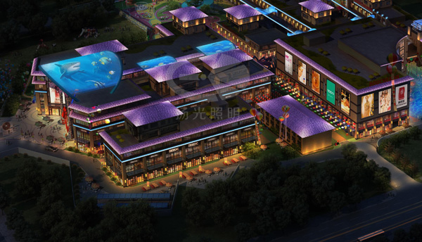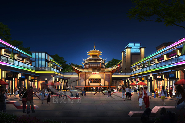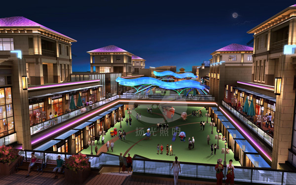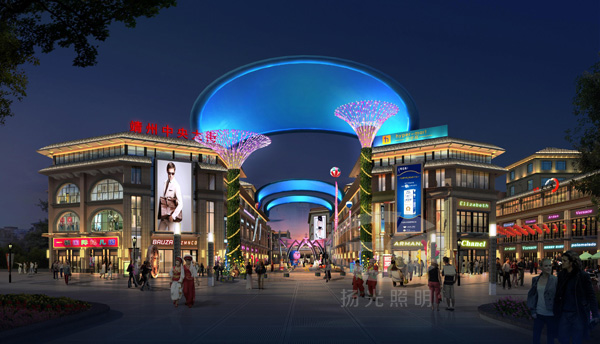 娛樂街入口——作為商業街的視覺的焦點,需要給人“過目不忘”的視覺印象。兩側立柱采用壁燈和投光燈將其打亮,表達夜間的基本照明,入口處的弧形頂棚,采用“投影燈”投射不同主題的圖案,夜晚燈光動感、豐富、視覺震撼,讓人漫步其中,有一個特別的體驗。